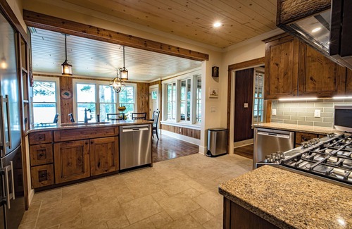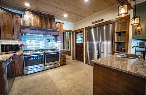 With all the small and large appliances you will need! The heart of the lodge is its expansive kitchen, ideal for cooking and dining together. With two refrigerators, two oven ranges, and two dishwashers, two microwaves, and the list goes on! The adjoining dining area features long lodge-style tables, beverage and wine coolers, and ample dishware. Multiple windows frame the breathtaking view of the lake, providing a perfect backdrop for meals shared with family and friends.