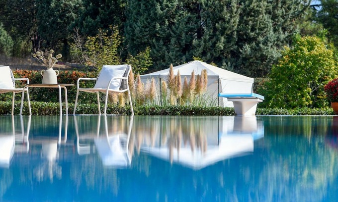 Best-rates for the Escape Villa in Melissochori starts from $622 per night with includes Parking, TV, Security/Safety, Wellness Facilities, Internet, Laundry, Pool, Private Pool, Bedding/Linens, Fireplace/Heating, Hot Tub, Child Friendly, Air Conditioner, Pet Friendly, Balcony/Terrace, Guest Services, Barbecue/Outdoor Cooking, Kitchen with all other amenities. Perfect for Weddings is committed to ensuring every guest experiences a comfortable and extraordinary stay, whether planning a romantic getaway, a honeymoon, a pet-friendly stay, or celebrating with the entire wedding party.
