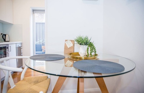 Tucked away in the historic pocket of Ashfield, this thoughtfully-designed studio features an open plan design with living, dining and gorgeous leafy courtyard. It's generous in size, offering a TV and two arm chairs for easy viewing. A galley kitchen is fully-equipped with all the essentials, including a dishwasher and combination microwave and oven. Cook meals and enjoy them on the glass-topped table inside or out in the lovely, private courtyard with relaxed seating.