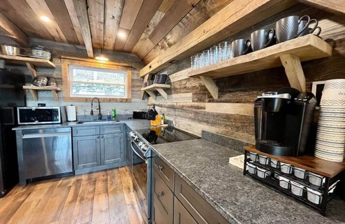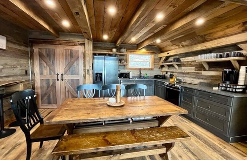 On the first floor of the main house, guests will enjoy a fully-equipped kitchen complete with a 5 burner electric stovetop and ample seating; spacious living room with floor-to-ceiling windows showcasing the breathtaking view, extra large flatscreen smart tv, and cozy seating; and convenient amenities like a half bathroom and pantry with washer/dryer. Indulge in luxury in the primary bedroom, a sanctuary with soaring ceilings and the rustic charm of reclaimed wood. The ensuite features a rejuvenating rainfall shower head and his and her vanities.