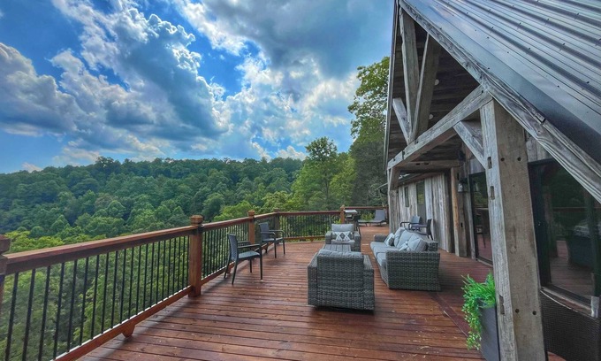 Estill Oaks is a rustic retreat on 80 acres, perfect for large groups, nature lovers, and families. Featuring a main house and bunkhouse with reclaimed wood finishes and superior design, it offers a unique stay in the Red River Gorge area. Enjoy smart home features like WiFi, indoor/outdoor speakers, and adjustable lighting. With stunning views, trail access, and luxurious touches, Estill Oaks is an ideal getaway for up to 16 guests.
