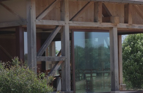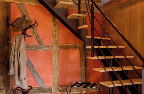 Each suite opens onto a decorative half-timbered screen that adds charm and privacy to the outdoor space. The warm tones of the interior walls, the exposed wooden beams, and the generous glass surfaces create a cozy and inviting atmosphere where rustic character meets contemporary comfort.