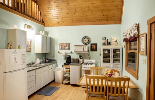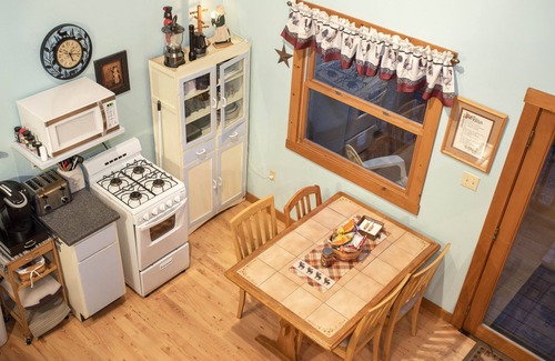The living room features a gas fireplace and a new 32" HDTV and Blu Ray DVD player with a growing video library. Because of all the trees in this beautiful secluded wooded area, Cable TV and Satellite Dish systems are not accessible or available at this time. Please be sure to bring your own favorite DVDs to enjoy during your stay, as well.