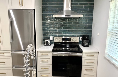 There is an open kitchen and living room area that opens via an oversized sliding glass door into the back yard. The kitchen offers everything you will need to prepare any meal including plenty of storage and brand new appliances. The living room offers mid-century furnishings, a 50 inch Roku TV. Full cable programming is provided. The home offers very HIGH speed internet of 200 mbps so you can stream or easily work from home.