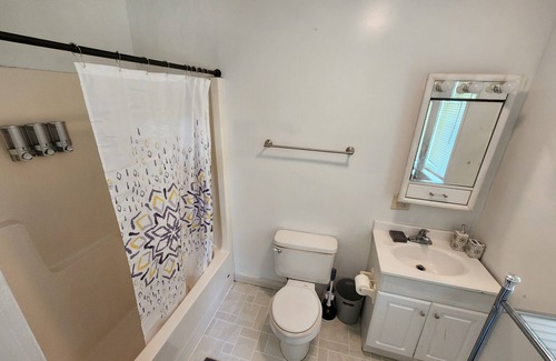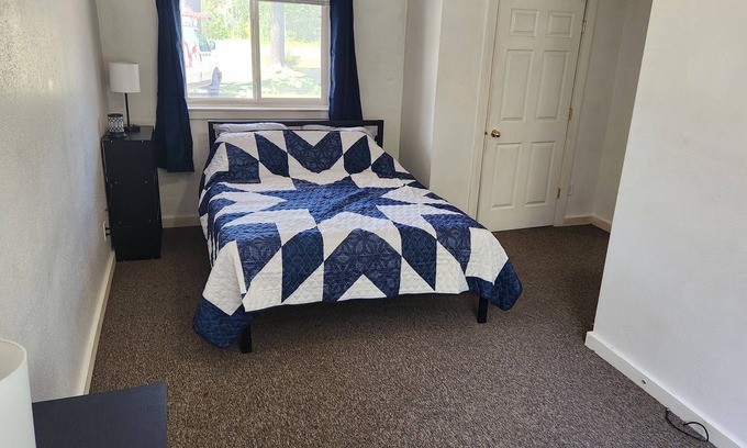 The bedroom features a comfortable queen bed, ensuring a restful night's sleep. The bathroom is equipped with a hair dryer and a refreshing shower. Additionally, there is an inviting living room with a cozy sofa bed, providing extra space for relaxation. Stay connected with WiFi and enjoy the convenience of amenities like coin laundry, heating, and AC. We're happy to assist with any questions while you stay at our apartment.