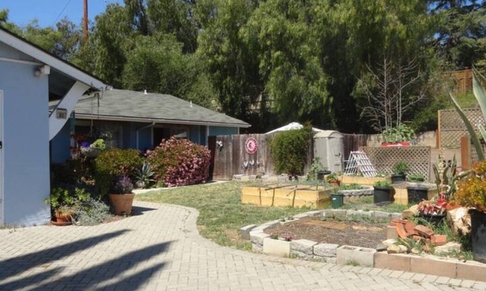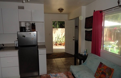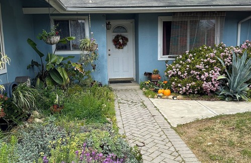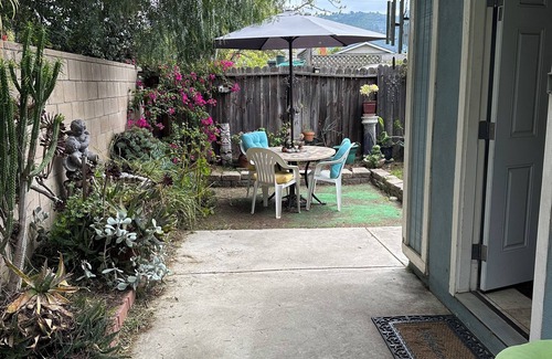 Private 1 bdrm with queen bed. Separate entrance, Kitchenette, ( please note there is no stove) yard, patio with table and umbrella. Futon in living room area that can sleep 2 Children or 1 adult (2 adults if you do not mind being snug). Gas BBQ on patio for your use. 10 Minutes to Ojai & 15 minutes to down town Ventura and the beach. There are restaurants ,markets, thrift stores, the bus stop and laundromat all within a 10 minute walk from the house.