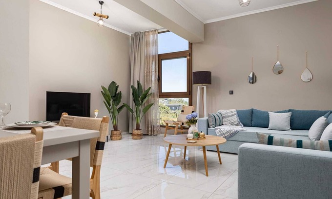 Evangelia Premium Residence is a beautiful cozy 60 sq.m apartment that combines modern comfort with boho-inspired decor, offering a relaxing and stylish stay near Chania. Bright and airy, the space is thoughtfully designed with natural materials, rattan chairs, and minimal tones, creating a cozy yet elegant atmosphere. Large windows fill the home with natural light, while the private balcony with a dining table provides the perfect spot to take in the stunning sea views.