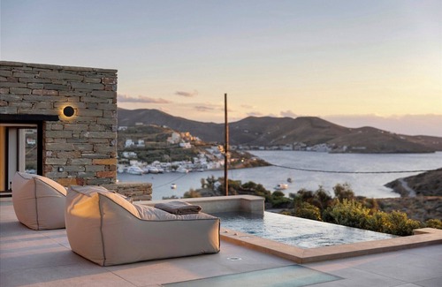 With its mix of rugged good looks and sleek contemporary design, Evanne rises in a super-panoramic position on the northwest coast of Kea. An infinity pool and a Jacuzzi offer aquatic pleasures and relaxing moments for those who prefer lazy, luxurious living, while the sandy beach and seafront bars and tavernas of Vourkari are within easy strolling distance for those who wish to enjoy the island's summery buzz.