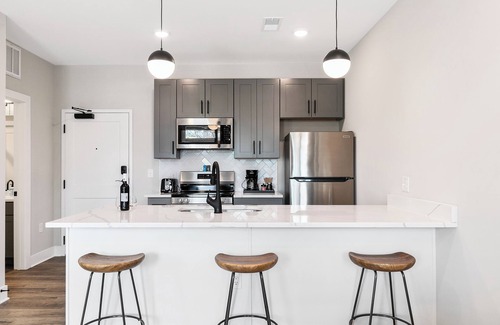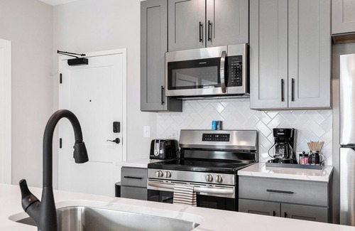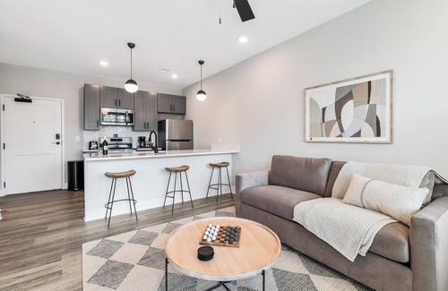 This brand new 600 square foot one-bedroom with a modern, open floorplan, comes complete with a queen-sized bed and restful queen-size pull-out sleeper sofa. Relax or work from home with free, high-speed Wi-Fi, full assortment of bath products, Leesa mattress on the main bed, and modern tiled rainfall showerhead. Your kitchen comes loaded with all pots, pans, cooking utensils and every dish you'll need. Off street compact parking space included with your stay and all other vehicles can park on the street with free, untimed parking. Enjoy two 50-inch HD Smart TVs, & fully stocked coffee bar to keep you going when you're "on the go."