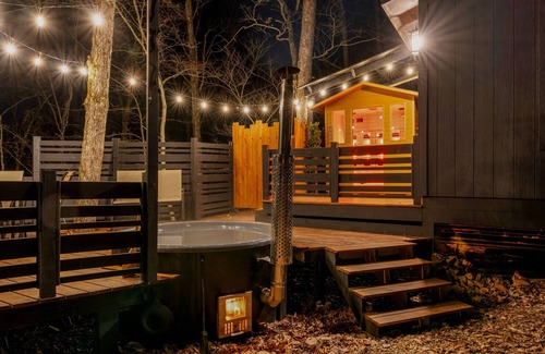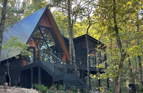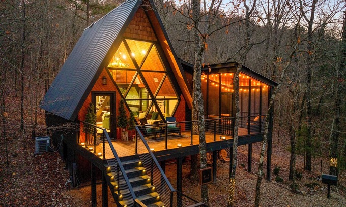 Perched high among the evergreens, Evergreen Dreams is a stunning blend of modern design and woodland whimsy. This 1,050 sq ft A-frame is wrapped in rich forest hues and made for romantic escapes and soul-soothing retreats. It sleeps up to 6 guests, with two dreamy king suites (one nestled in the open loft) and two cozy twin bunks tucked away just right. Inside, you’ll find a deep soaking tub, Casper Dream Mattresses, an electric fireplace, and a fully equipped kitchen. Step outside to your private deck with an infrared sauna, wood fired hot tub, firepit, and enclosed seating for peaceful forest mornings. Thoughtful touches—like soft robes, luxe linens, and smart TVs—make this treetop hideaway as comfortable as it is unforgettable.