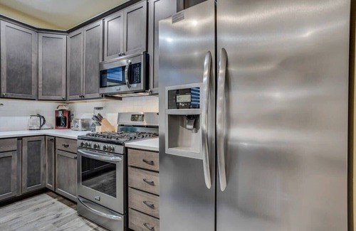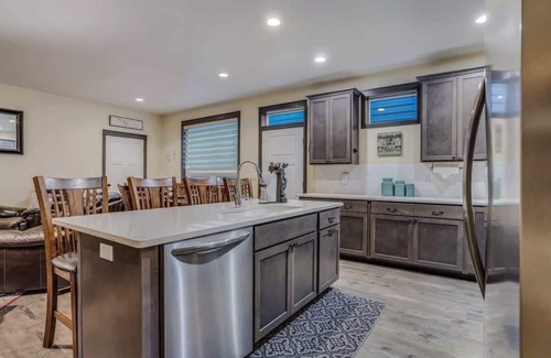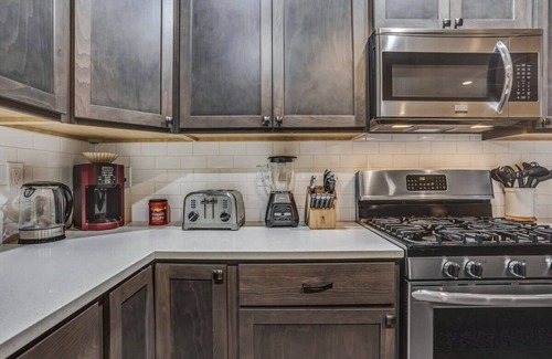 Wonderful for entertaining, the main living area features an open concept floor plan. The spacious fully stocked kitchen has gorgeous quartz countertops, an island with seating for 3-4 and stainless steel appliances. Adjacent to the kitchen, the wooden dining table seats 4 and has an easy to place leaf that increases the table seating to 8! Comfortable leather couches, a beautiful gas fireplace nestled in the corner and a large television makes the living room an inviting spot to relax. There are also games and cards in the settee if you decide to have a quiet night in.