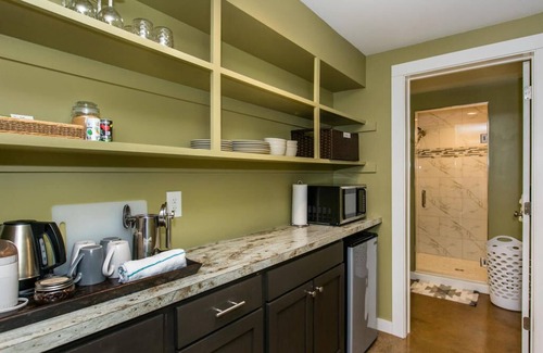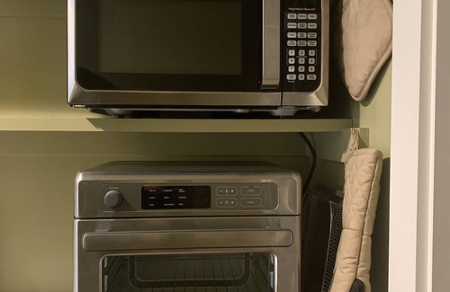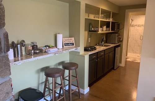 The Kitchenette area is connected to the living room area. It has a small bar top with two stools where guests can eat or use as a cooking prep area. The Kitchenette has a mini fridge, two burner plug in stove top, air fryer/toaster oven, microwave, electric tea pot, french press along with coffee grinder, old school drip coffee pot and other essential kitchen cooking supplies. Please note this is not a full kitchen even though it is very adequate for cooking quick and easy meals.