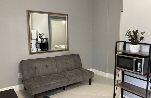This is a Cozy Studio with a private entrence through the side on a residential house it has a separate bedroom with a king size bed and separate kitchenet area with a sleeping sofa futon !!!!! Could sleep 3 adults or 2 adults and two children. Located in a safe and stablish neighborhood. Fully equip kitchen with all the amenities guest needs to fill like home away and to cook their meals and breakfast , plus the host is next door and if the guest forgot to bring something!!!!!!! !!!!we got it!!!!!! just let us know , We like you to feel like you are at home . We care for our guest , Just bring your bags and relax .