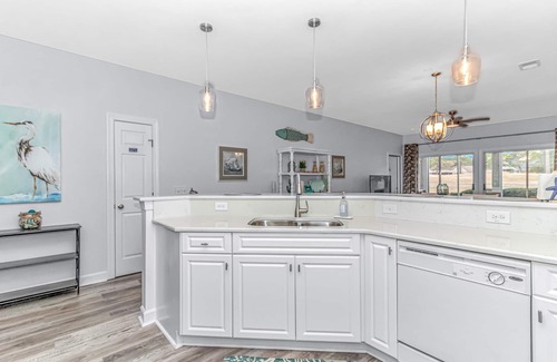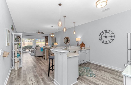 This condo is a result of love of the Sunset Beach area. We purchased this special property because of its location, size and view. This is a spacious, newly renovated luxury condo that features a great view of the 16th green on the Willard Byrd course and is 5 minutes from the beach. The unit has been beautifully updated with new flooring , furnishings , lighting , appliances, bedding , artwork, window treatments and decor. The main villa features a bedroom with a king size bed , smart tv with Roku , new dresser and nightstands and a full tile bath with tub/shower combo. The full service kitchen has quartz countertops, mirrored tile backsplash, new stainless steel stove , refrigerator and microwave and is fully equipped. The dining area has new table seating for 4 and bar seating for 4. The living room features new sofa, love seat, bench , accent tables , a 55” smart tv and sliding glass doors to a furnished screen porch. High speed internet is provided.