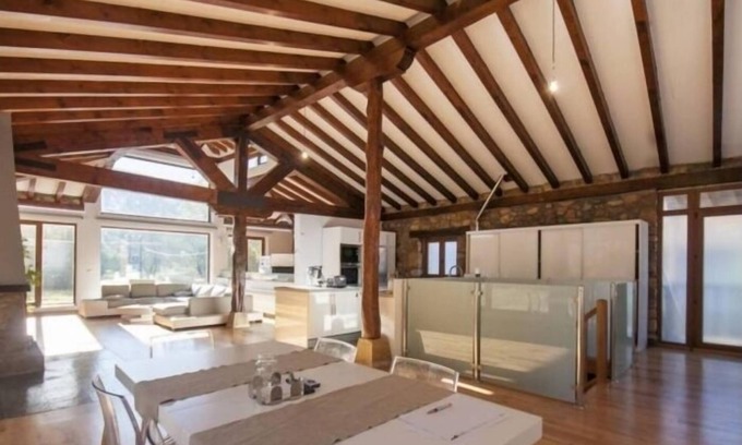 This beautiful house is located in the quiet village of Casa de Monte in Pámanes. The interior of the house is bright with large windows that allow you to see the mountains from the inside while enjoying privacy. It is a large open space with a living room with integrated kitchen, dining room, fireplace and a separate room with three single beds, a large bedroom of 30m2 with XXL bed and a bathroom with jacuzzi.