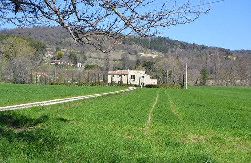 The landhouse, restored in 2011, is located in the countryside, in the midst of green fields of sight. It enjoys complete privacy. In the south, a white gravel terrace with large teak table and chairs will be your favourite place for dinner under the canvas arbor and for laze and enjoying cicadas singing, two other pretty canvas arbors are available. A second terrace is located toward the bottom bedroom and still side of the house, a semi-covered terrace is also available. A walk path leads directly to a small river, "Le Jabron." The large pool has a background in diamond point 1m80 deep and grand staircase gradual descent. It is nicely furnished with a small garden of aromatic plants and an outdoor shower.