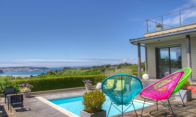 It has all the necessary amenities and a heated pool avec'un lovely garden not overlooked. The view of the bay of Douarnenez is breathtaking. Due west! Incredible sunset.