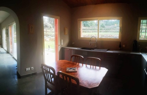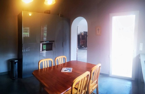 Fully equipped kitchen: cooking room, (piano 5 fires and oven (1m) dishwasher, hood, microwave, coffee maker, and all the utensils for a kitchen extra or more elaborate with cast iron casseroles, pressure cookers, halogen oven, various robots, battery of pie molds and various. Fridge .View on the hill and access to the terrace.