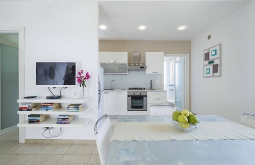 The apartment consists of a living room with a comfortable sofa, an open kitchen with dining table, a bathroom with shower, bidet and toilet, and a double room with stunning sea view.