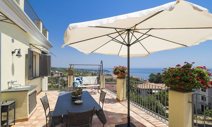 Casa delle Alohe is halfway Catania and Acireale on the second and upper floor of a modern villa. The bright living room has access to one of the two furnished terraces with stunning sea views. Stairs lead to a second terrace, on the roof, with a 360-degree view. This terrace is perfect for sunbathing.