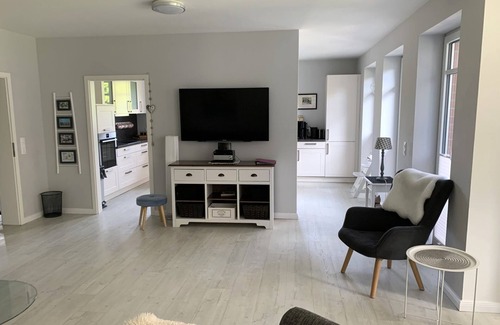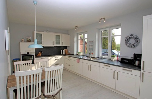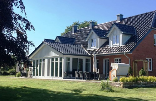 Large apartment in a country house in a quiet outskirts just 5 km from Flensburg Fjord. A 60sqm living room with fully equipped kitchen, seating, armchairs, fireplace, TV wall, beautiful winter garden with a view of the garden and large dining table. One bedroom and bathroom at ground level, 3 bedrooms and a full bath with infrared cabin in the 1st Floor. Enjoy the spacious terrace with garden furniture, beach chair, parasol, grill and loungers to linger. On the courtyard area with sufficient parking, playground and soccer field, an annex with table tennis, billiards, darts, soccer kickers offer a variety of leisure activities. The central location enables many beautiful excursions in the surrounding area.