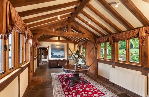 The remaining three bedrooms can be found in the adjoining Stables and include the Peacock Suite with its double fronted fire that links the bedroom and en-suite bathroom. Peacock has a four-poster super-king sized bed and a huge bathroom with separate walk in shower and a bathtub situated in-front of the fire. A separate WC with hand painted birds and bamboo mural completes this suite. Spire has a super-king sized four-poster bed and an art deco bathroom with separate shower and roll top bath. Wisteria is a king room with a beautiful hand painted mural of wisteria flowers climbing up the walls, it also has double doors out onto its own private deck and an estate view. Completing this room is a large en-suite bathroom with pink marble walk in shower.