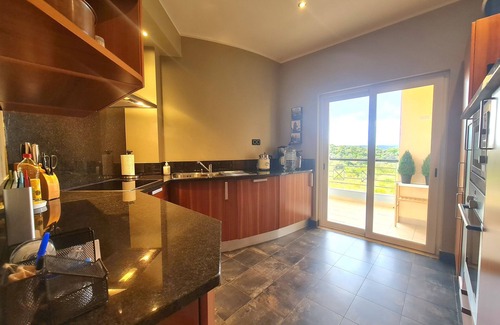 It features a spacious open-plan living room with dining area, CD player, and a large Smart TV with internet access. The excellent kitchen is equipped with a ceramic hob, oven, dishwasher, washing machine with dryer, fridge-freezer, microwave, kettle, coffee machine, toaster, and more. The small balcony offers a beautiful view of the Monchique mountains.