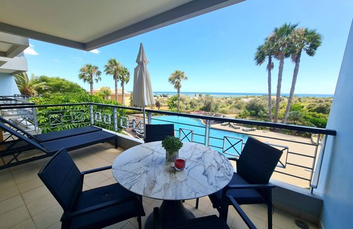 The large balcony is furnished with garden furniture and two sun loungers, offering a fantastic view of the pool area and the sea.