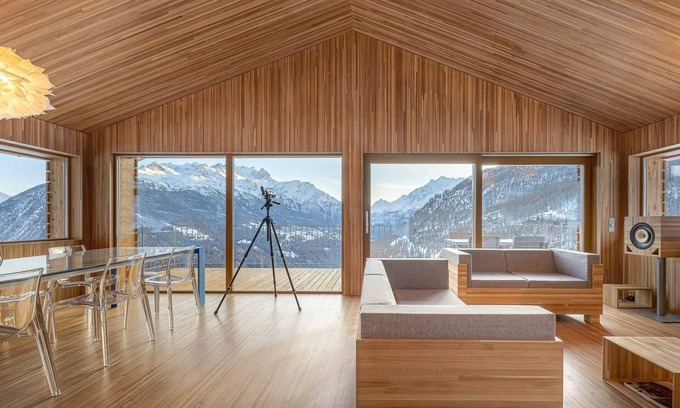 The view from the chalet goes directly to 9 four-thousand mountains in 3 mountain ranges.