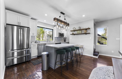 The spacious kitchen features bold black tilework, wooden countertops, custom cabinets, and stainless steel appliances. The sleek and stylish kitchen is big enough for multiple guests to move around, and is complete with cooking essentials, including a Keurig, coffee pods, and creamer.