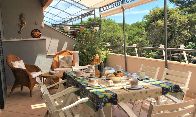 Large terrace equipped with garden furniture equipped with a large extendable table with chairs for lunch and dinner but also to spend pleasant moments in relaxation breathing the wonderful fresh air that the pine forest gives off, or to feel the waves of the sea that seems to have them at home, corner barbecue.