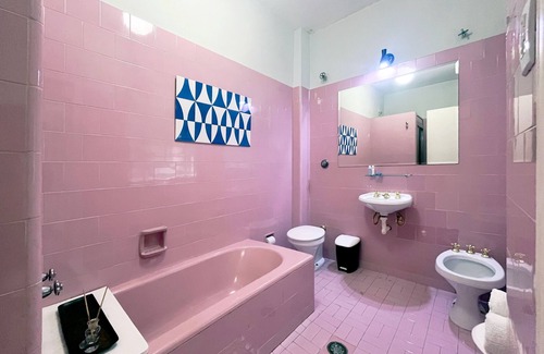 • Private bathroom in pink tones with a unique vintage design