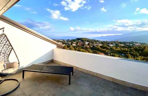 Enjoy the stunning 180° panoramic view of the sea and the Učka Mountains towards Opatija from the three terraces and the private pool of our apartment on the border with Istria.