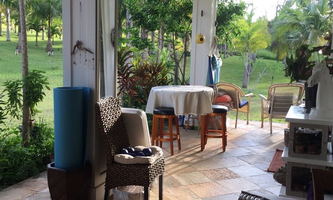 this 3 bedroom 2 bath home was built to owners specifications less than twelve years ago. Ten foot ceilings and lots of windows makes this home a sweet pleasure to wake up to. White walls and many of the owners original abstract paintings create a gallery like feel to the interior. . 2 covered patios with BBQ areas are available. you can bask in the early morning sun or watch the sun go down through the palm plantation on the property. there is a tub in the main bath and stone lined showers. master bath has 2 sinks. lots of flowers birds and rare native plants on this property. The cottage is also available on the same property for 2 people. your party of 8 could be accommodated for the holidays!! Just to note the 3rd large bedroom has an outdoor hot and cold shower. No toilet yet. Double sink inside. We do experience mosquitos here. Not all the time. Lots of repellent available for use. Aloha. Audrey Antone