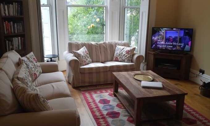 There have been over 325 positive reviews for this spacious, one bedroom, ground floor, self-contained flat in an 1860's period conversion with many original features, high ceilings and recent new furniture, fixtures and fittings. Accommodation for up to 2 in the one bedroom with Queen bed (60ins w x 80ins l) with fitted sheets and duvets with a choice of down or hollow fibre pillows. Single duvets can be provided if preferred. Fully equipped kitchen with fridge and freezer, washer/ dryer, microwave, toaster, electric kettle, filter coffee maker, gas hob and electric fan oven, bathroom with bath and shower, bathroom scales, towels and facecloths and electric extractor fan. A hairdryer (Non-UK hairdryers, particularly those from the US, tend to trip the fuses!) and multi-point plug adapters are also provided. Fully furnished with central heating, satellite HDTV and DVD player. FREE WiFi with 35+mgbs speed.