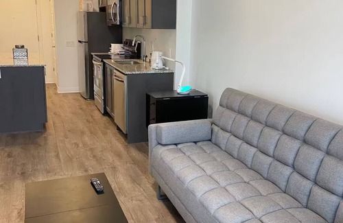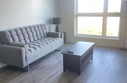 Have fun with the whole family at this stylish place. Enjoy a luxury, clean 1-bedroom 1-Den apartment in Oakville, perfect for families or groups. Features queen bed, twin bed, sofa bed, smart TV 55” with channels, WiFi, washer/dryer, and a fully equipped kitchen. Hair dryer & steam iron for your convenience. Building amenities include a gym, BBQ area, and rooftop terrace with great views. Conveniently located near amenities and transit. No smoking or vaping. Book your stay today!