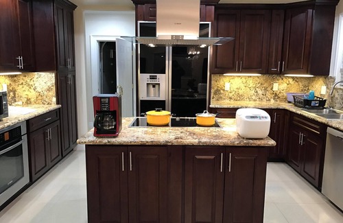 The full private kitchen has beautiful island granite countertop with German Gaggenau cooktop. In the kitchen, you are surrounded by Bosch exhausted hood, Bosch dishwasher, Bosch convection oven, Panasonic microwave, and double-wide GE refrigerator/freezer. There are a coffee maker, toaster, blender, plates bowls, spoons, forks, etc. This home has a full-size washer and dryer.