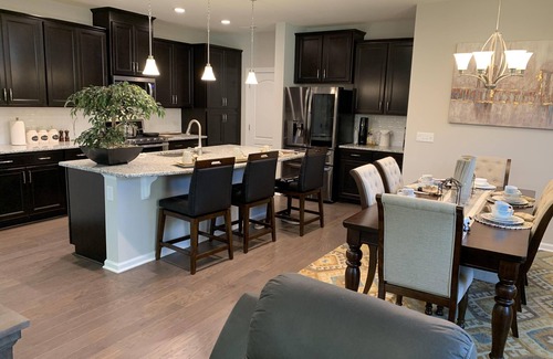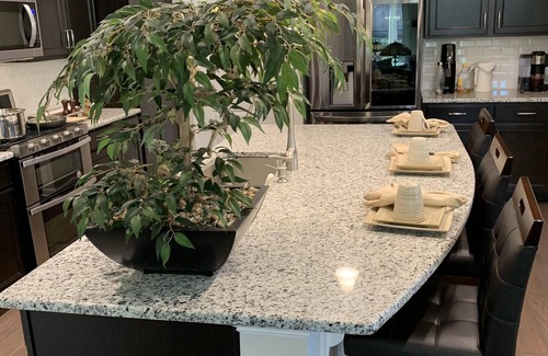 ...an open floor with living room furnished with sofa (three seater) and love seater and leather chair and leather recliner, fire place, large TV, spacious kitchen with all upgraded appliances like microwave, two door cooking range, five door refrigerator with large freezer, convertible freezer compartment and hotel collection utensils all brand new, coffee and coffee makers (both k-cups and filter, tons of cooking vessels, tea kettle (you name it) dinning area that accommodates 8 dinners and breakfast area with large granite counter with rotating leather chairs and more ....half bath, patio with table and chairs separating with a large sliding glass window.