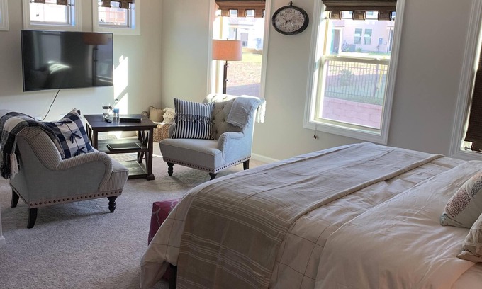 Centrally located, BRAND NEW CONSTRUCTION with spacious MASTER BED ROOM with KING BED, sitting area, large TV, work station area, large bath with shower cabin and bench, walk in closet.