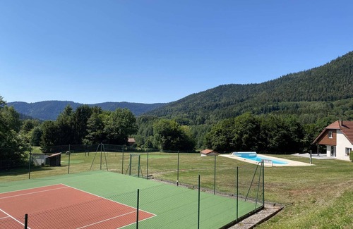 Tennis: Our tennis court offers a spectacular view of the hills and forests of the Vosges. The tennis court uses a very popular surface in France from the renowned supplier COTENNIS (porous concrete coated with pure acrylic paint with silica using the TENNCOURT process). This surface makes it possible to play again very quickly after rainfall. A few minutes are enough to achieve complete drying. The court is pleasantly fast and complies with ITF 5. We can recommend allcourt tennis shoes for playing.