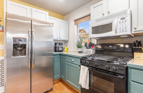 Adjacent to the kitchen, the living area invites you to unwind with a comfy sofa, coffee table, smart TV, and end tables, making it the perfect spot for relaxation and entertainment. Extend your living space outdoors to the duplex's welcoming balcony, surrounded by a picturesque front yard and a lush backyard. The community fire pit, BBQ grill, and outdoor camera add enjoyment and security to your outdoor moments.