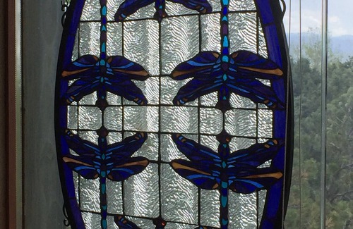 The living room with its custom bronze entertainment cabinet, kiva fireplace and wet bar offers relaxing evenings. Dragonfly has a fully-equipped kitchen with professional range-oven, espresso maker, waffle maker and more, and a breakfast bar that opens to a gracious formal dining room with kiva fireplace. Enjoy 4 master bedroom suites (k, q, q +twin, 2 twins), each with unique decor, ensuite bath, walk-in closets...a rare find in Taos. (Extra nomad floor foam mattresses and queen sofa bed available for larger groups). With living, eating, and sleeping areas both upstairs and down, it feels like two houses! Enjoy our pianos, drum set and other instruments. With HI-SPEED FIBER, It’s a great place for work and play!