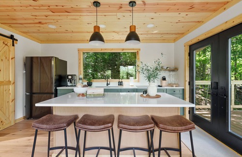 The Jaxon House comfortably accommodates up to four guests, featuring a king-sized bed in the upstairs bedroom boasting breathtaking views, as well as a plush Italian leather queen sleeper sofa in the living area.