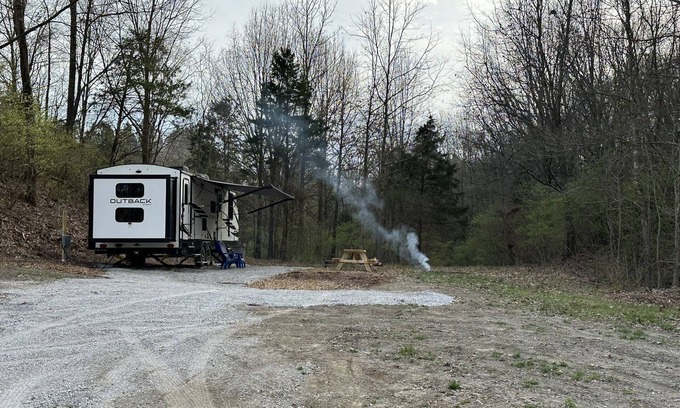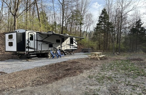 Relax and rejuvenate with a luxurious glamping experience in the woods. Off the beaten trail - Enjoy your own private hot tub spa, beautiful lake-view, deluxe RV travel trailer, and amazing site for star gazing.