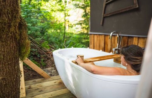 Golden Ears Glamping has ONE glamping tent, is elevated in the cedars right above Alouette River. Your own self contained private escape. Personal bath and kitchenette and bbq along with an outdoor soaker tub for two. Come Relax, Rejuvenate and Romance! Swim, Fish, Hike, Float, Soak, Unwind!