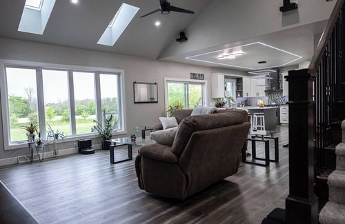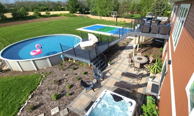 Welcome! NEW spacious 4000ft² lodging centrally located: 5 World-Class golf courses, Road America, Elegant Wineries/Spas/Restaurants/Shops, lake front. Eclectic Luxuries: hot tub (by 5/26/23), crystal clear 30' pool, 2-person steam room/6-port digital Kohler shower, 4 bathrooms, private bball/vball/pickle ball court, big upper/lower decks ideal for sunset drinks/morning coffee, 12' wet bar, secluded 1.5 acres, walkout basement, exercise rm, smart home, air hockey, high ceilings, garden-pick what's ripe, fast 316 Mbps Mesh Network.