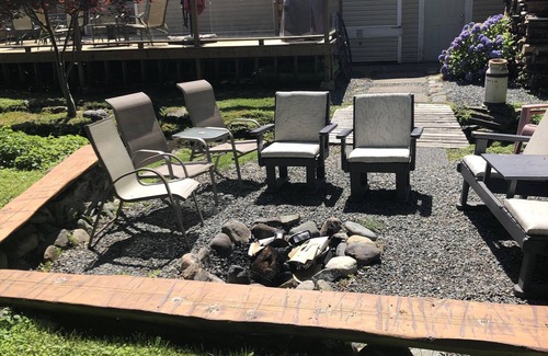 The backyard boasts a spring fed creek that is absolutely stunning and runs ice cold year round. There is an amazing fire pit area for campfires. In the summer, if there's a burning ban, we also have a portable propane fire pit so you will not go without!