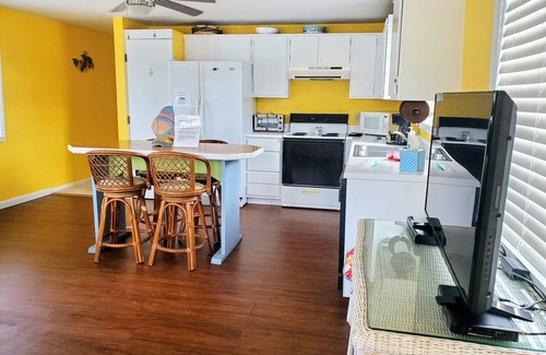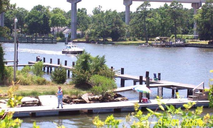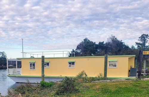 Our houseboat on the Intracoastal Waterway. Sit on the front porch and watch the yachts and commercial fishing boats go up and down the waterway. Bring your fishing pole and your boat. We have a wet slip available, so you can hop on and go! Cook what you catch or cook your favorite steak on a grill. There is a full kitchen with a dishwasher. There is a Queen size bed in the master bedroom and twin beds in the second bedroom.