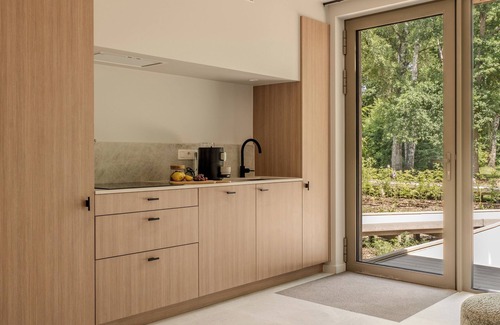 The Suite is ideal for a romantic weekend escape or a cozy stay for two. The lodge features a tastefully decorated bedroom with a kingsize bed, always prepared for you. The modern bathroom comes with a double sink, a spacious shower, and all necessary towels. The open-plan kitchen is equipped with amenities such as a Nespresso coffee machine, a combination microwave, and a dishwasher, making it easy to prepare a delicious meal. The living room leads out to a sunny terrace with garden furniture, perfect for enjoying the afternoon sun.