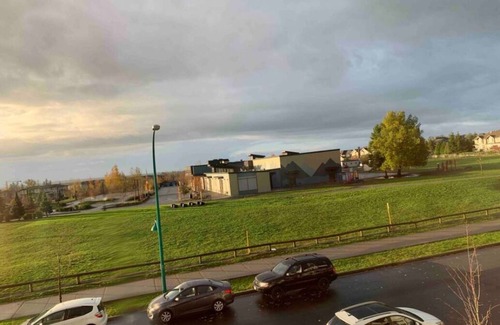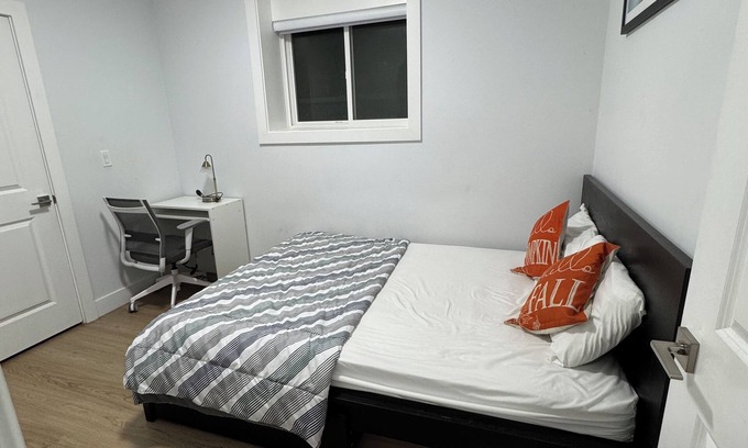 Experience luxury and security in our new, beautiful 2 bedroom 1 bath suite with a spacious bathroom and stunning view from outside. It's located in front of the park. Enjoy radiant heating and all control from the comfort of your suite. Private kitchen and living room for your daily needs. Secured with house security and smoke alarms. Book your stay now for the ultimate comfort and luxurious stay.